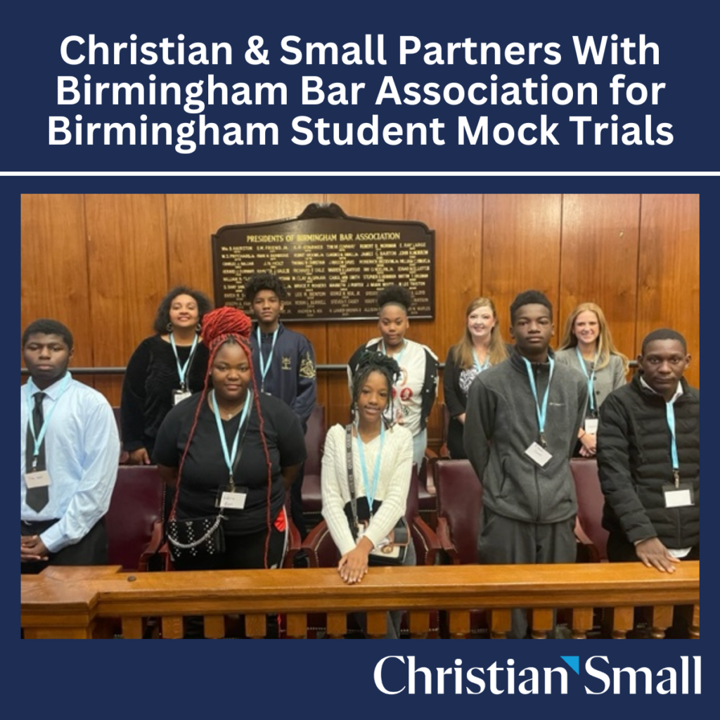 The competition included 41 student participants from area high schools including Jackson-Olin, Carver, Woodlawn, Ramsay, and Parker. Christian & Small attorneys Sharon D. Stuart, Priscilla K. Williams, and Maggie H. Clanton coached the trial team from Jackson-Olin High School. At the conclusion of the day’s trials, two JO students were named Outstanding Attorneys, and two JO students were recognized as Outstanding Witnesses.