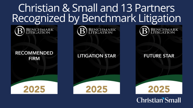 Christian & Small is pleased to announce that thirteen partners are recognized in the 2025 edition of Benchmark Litigation. Recognized as 2025 Litigation Stars are John Johnson, Richard E. Smith, Daniel D. Sparks, Sharon D. Stuart, Michael A. Vercher, F. Todd Weston, and new to the list this year are Bill D. Bensinger, Greer B. Mallette, Neal D. Moore, and Jim Pattillo. Recognized as 2025 Litigation Future Stars are Christina May Bolin and M. Jansen Voss. In addition, the firm received a recommended ranking for the state of Alabama.